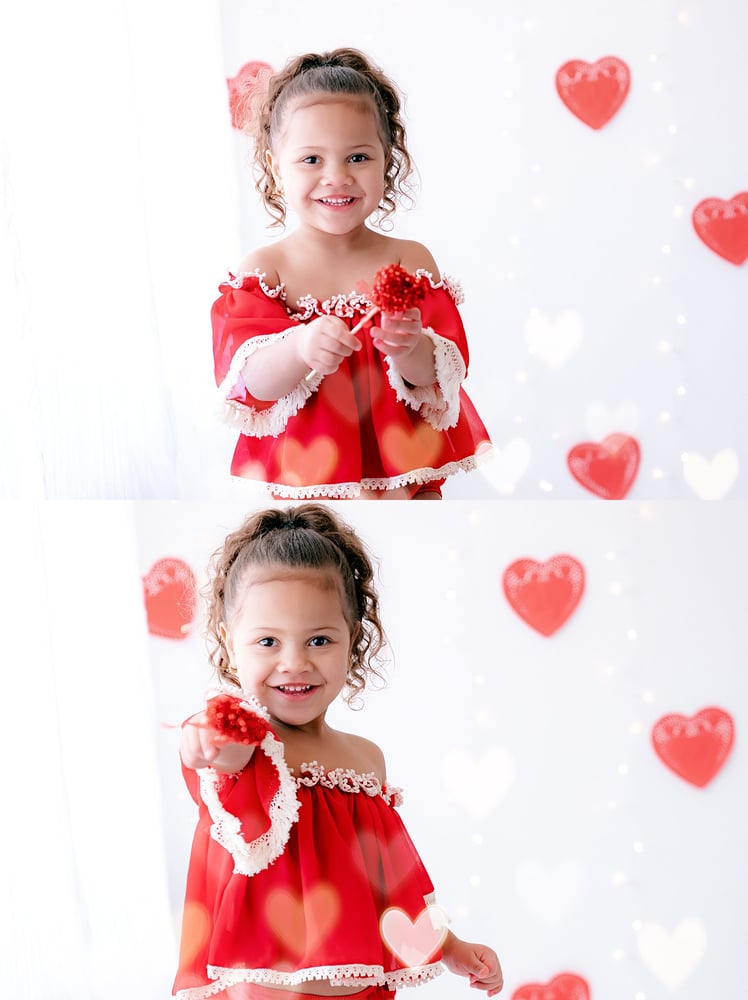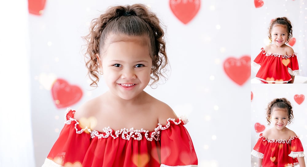 All you need is love! White and red heart set, twinkling lights, with large white posing boxes, clear chair, pink couch, red florals and more!
